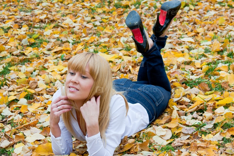 Светловолосая девушка лежит на листьях в осеннем парке