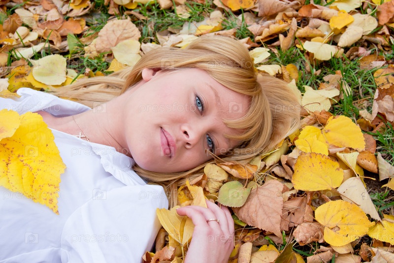 Светловолосая девушка лежит на листьях в осеннем парке