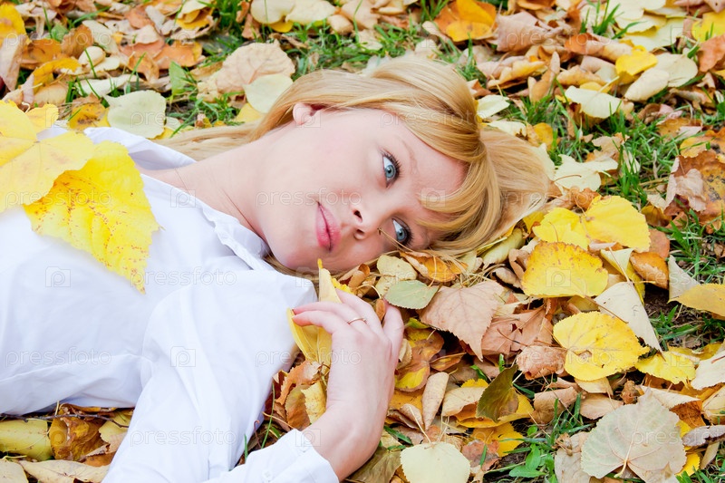 Светловолосая девушка лежит на листьях в осеннем парке