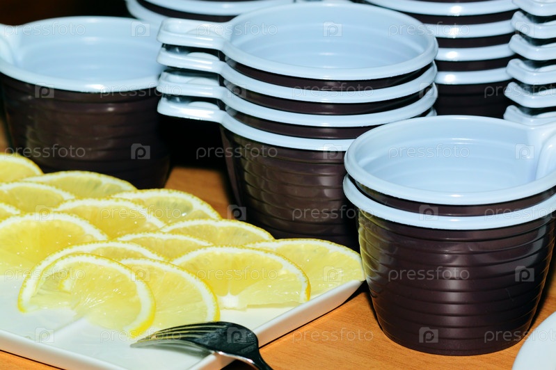 Одноразовые кружки и нарезанный лимон на тарелке крупным планом