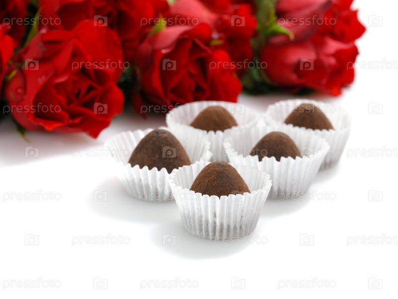 Букет красных роз и шоколадные трюфели крупным планом на белом фоне
