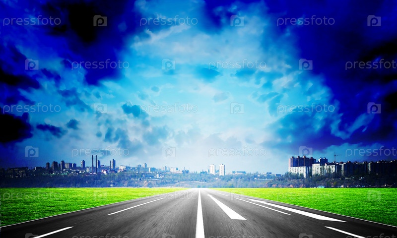 Автомобильная дорога, ведущая в город, и предзакатное темное небо