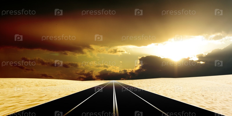 Автомобильная трасса, проходящая через пустыню, и предзакатное темное небо