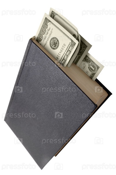 Книга с закладками из долларов на белом фоне
