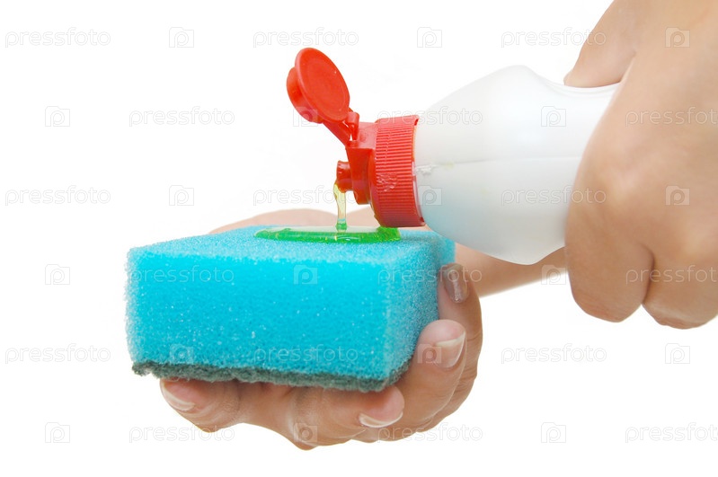 Женские руки с моющим средством и кухонной губкой на белом фоне