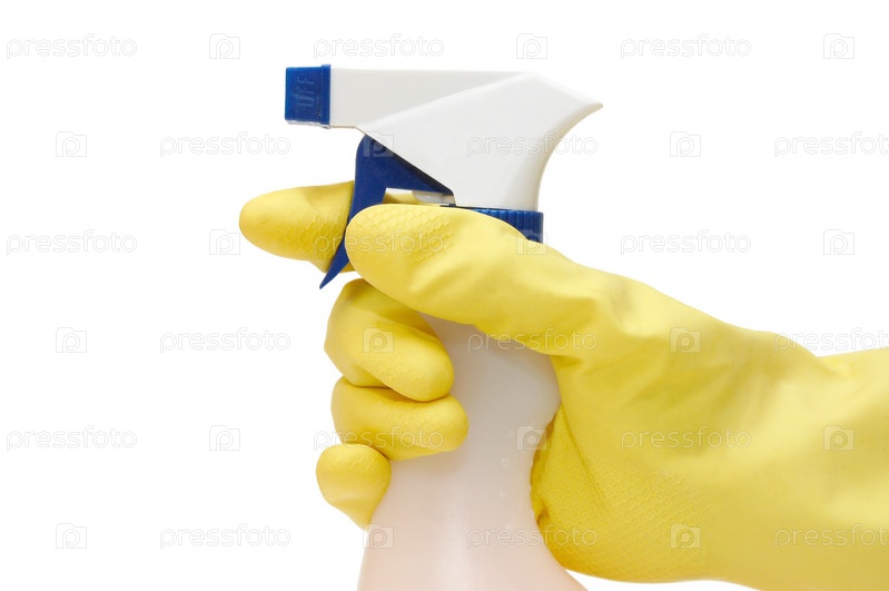 Рука в перчатке с моющим средством для окон на белом фоне