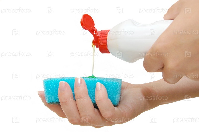 Женские руки с моющим средством и кухонной губкой на белом фоне