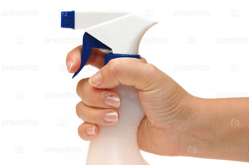 Женская рука с моющим средством для окон на белом фоне