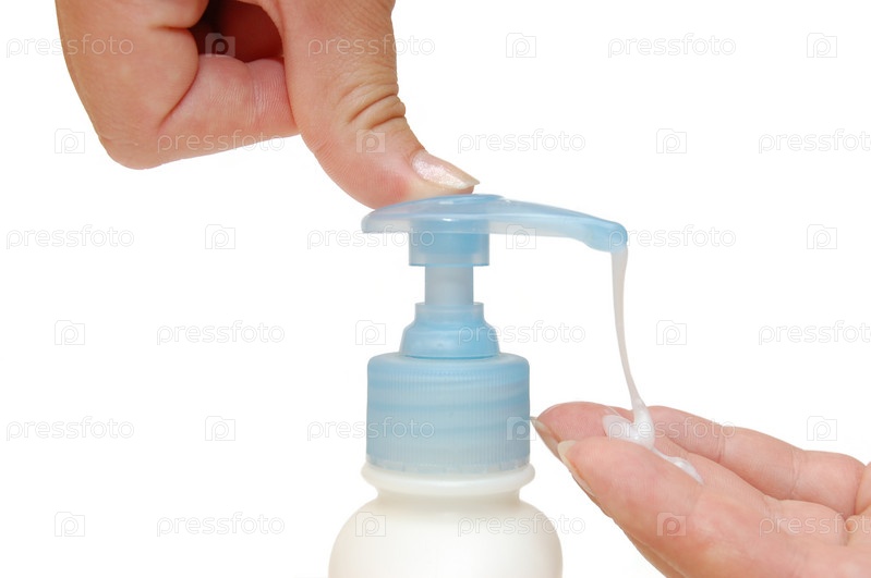 Женские руки с бутылочкой жидкого мыла на белом фоне