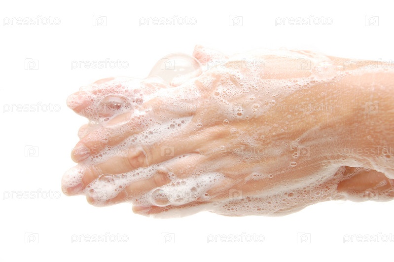 Женские руки в мыльной пене на белом фоне