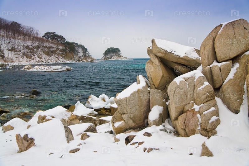 Скалистое морское побережье в снегу