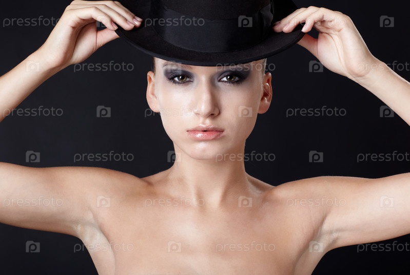Портрет красивой молодой девушки, которая позирует со шляпой на черном фоне