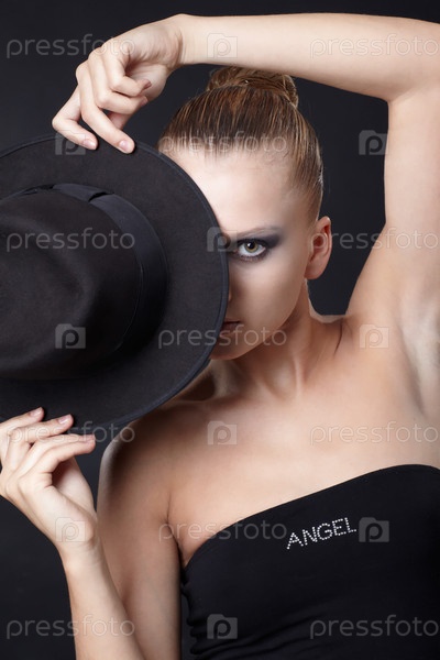 Портрет красивой молодой девушки, которая позирует со шляпой на черном фоне