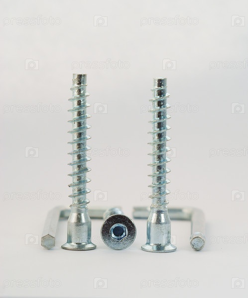 Новые металлические винты-саморезы с головками под шестигранный ключ и шестигранные ключи на сером фоне