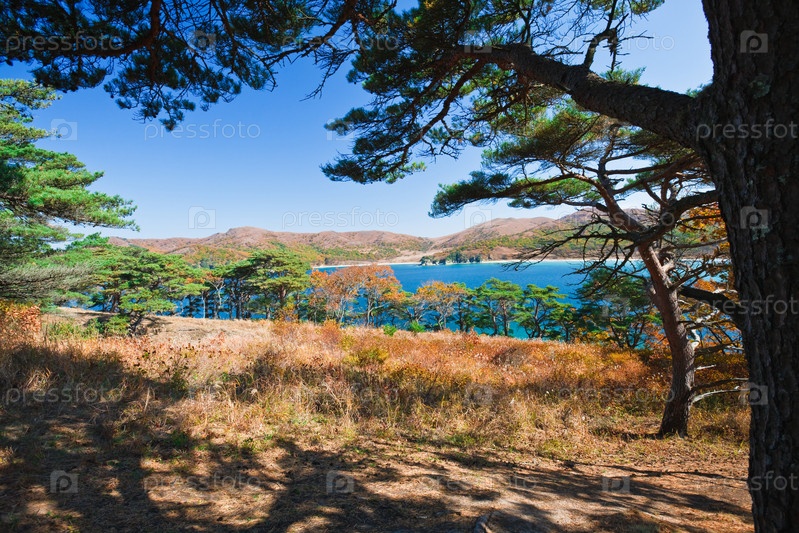 Осенний морской пейзаж с хвойными деревьями
