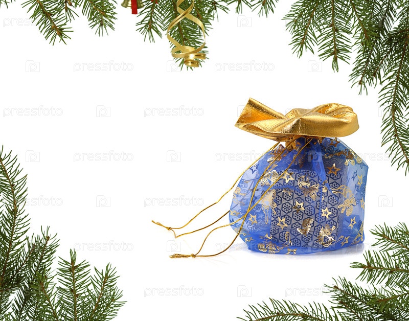 Синий рождественский подарок и зеленые веточки ели