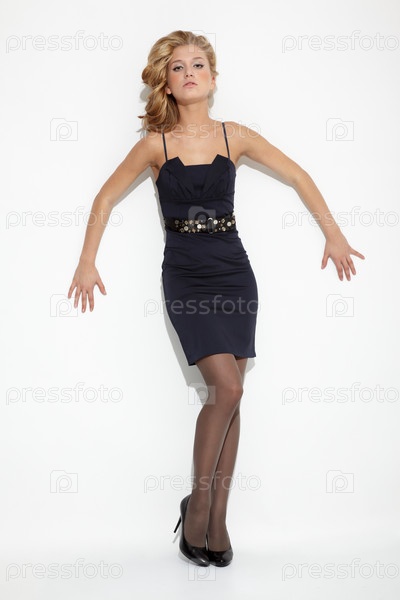 Красивая молодая девушка позирует в черном платье на белом фоне