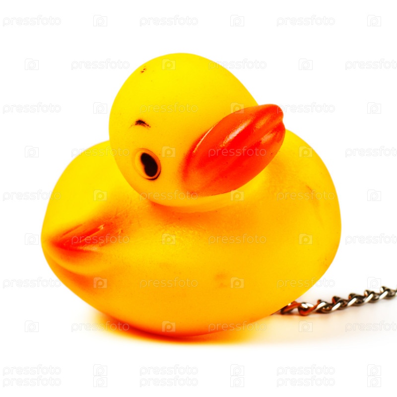 Резиновая утка для ванны с цепочкой на белом фоне