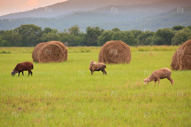 Овцы пасутся на лугу среди стогов сена