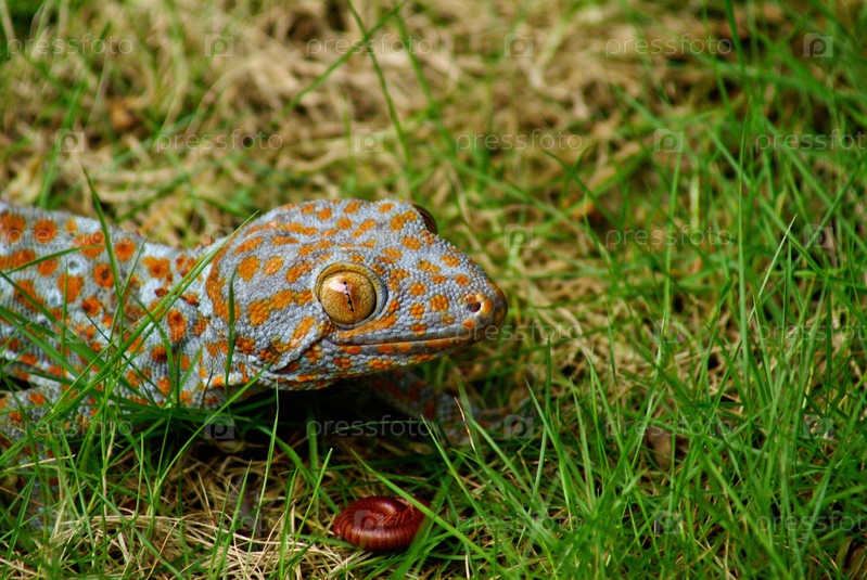 Токай геккон на фоне зеленой травы