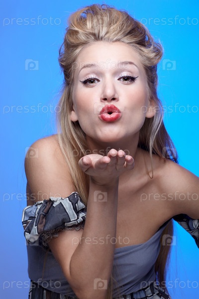 Красивая молодая девушка с длинными волосами посылает воздушный поцелуй