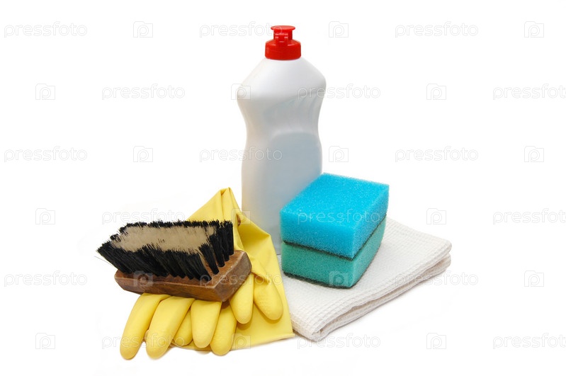Бутылка с моющим средством и перчатки для уборки на белом фоне