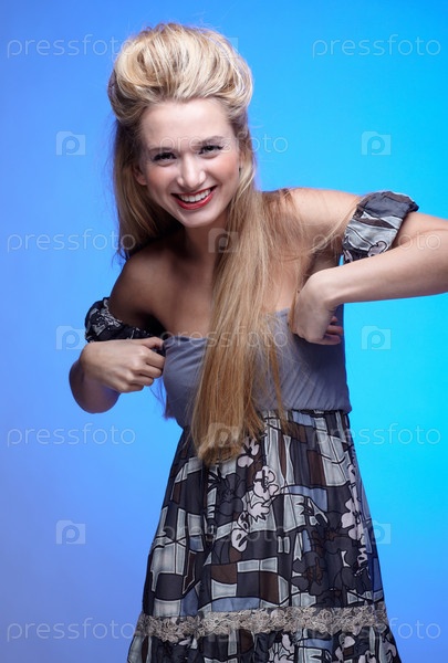 Красивая молодая девушка с длинными волосами на голубом фоне
