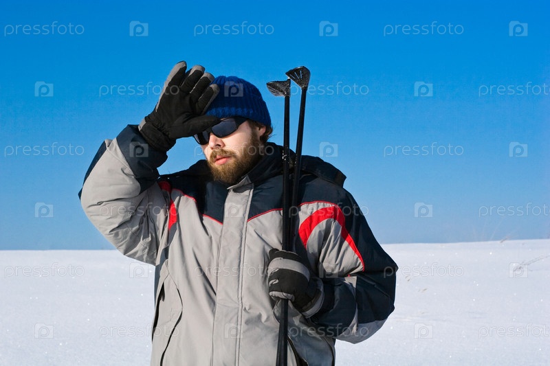 Портрет усталого лыжника в снежном поле на фоне голубого неба