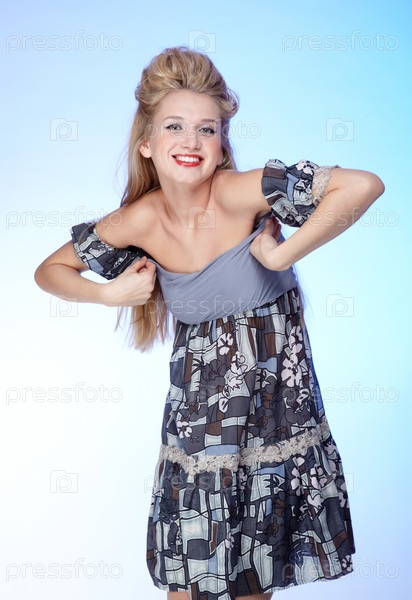 Красивая молодая девушка с длинными волосами на голубом фоне