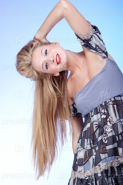 Красивая молодая девушка с длинными волосами на голубом фоне