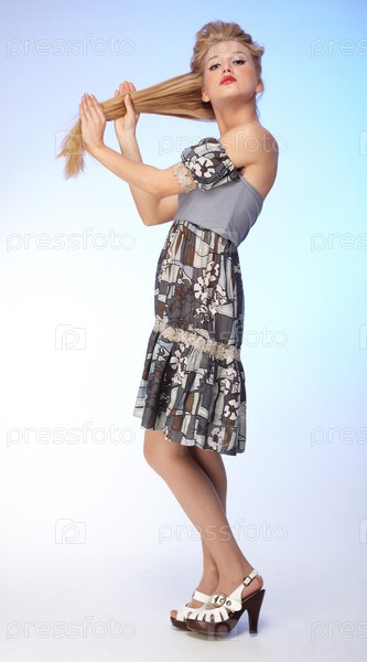 Красивая молодая девушка с длинными волосами в полный рост на голубом фоне