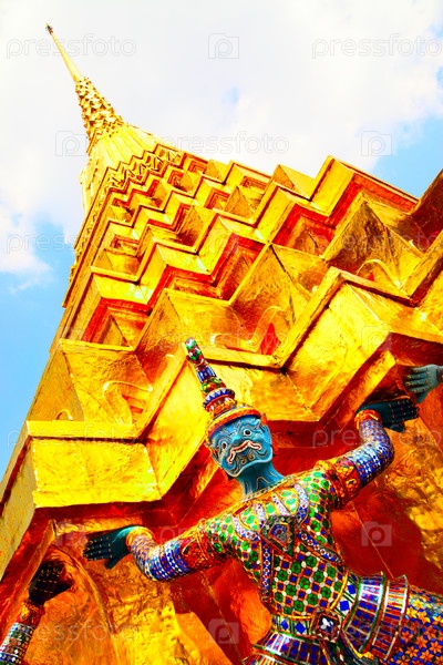 Золотая ступа и статуя воина в храме Wat Phra Kaeo, Бангкок, Таиланд
