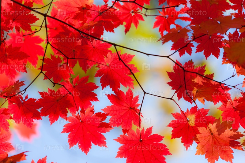 Кленовые листья на ветвях в осеннем лесу
