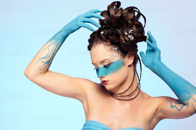 Портрет молодой девушки с голубой полосой на лице. Боди-арт "Русалка"