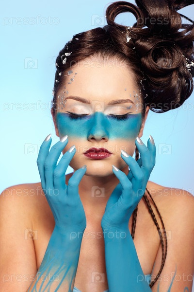 Портрет молодой девушки с голубой полосой на лице. Боди-арт "Русалка"