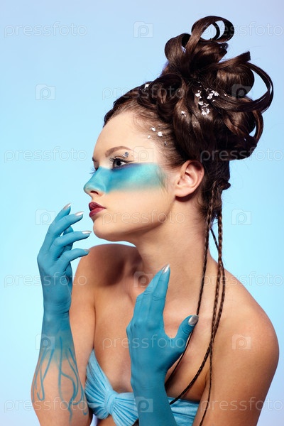 Портрет молодой девушки с голубой полосой на лице. Боди-арт "Русалка"