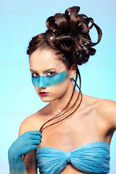 Портрет молодой девушки с голубой полосой на лице. Боди-арт "Русалка"