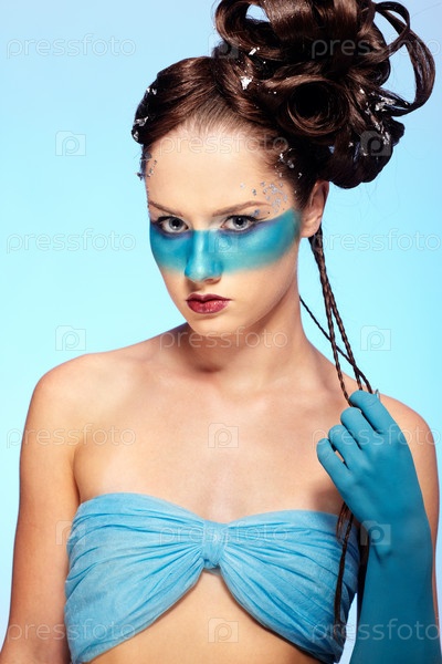 Портрет молодой девушки с голубой полосой на лице. Боди-арт "Русалка"