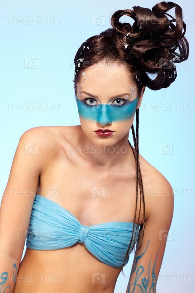 Портрет молодой девушки с голубой полосой на лице. Боди-арт "Русалка"