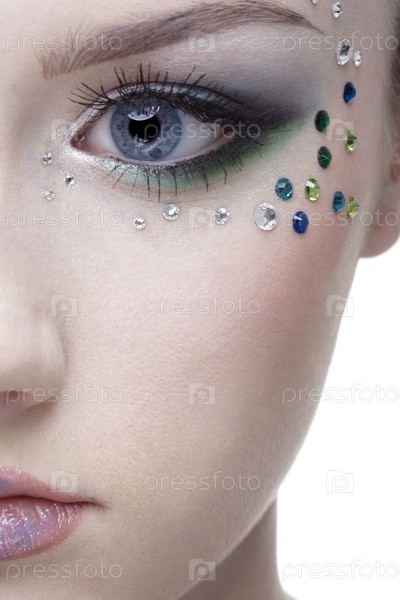 Половина лица девушки с ярким макияжем и стразами