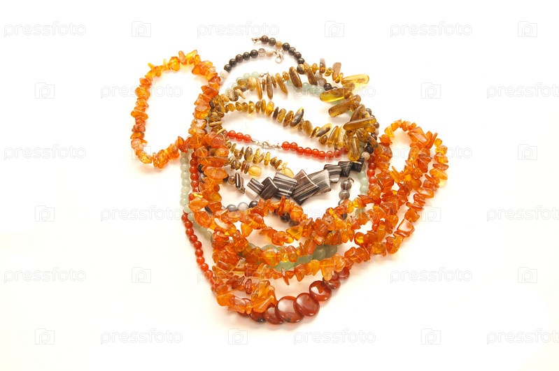 Бусы из разноцветных камней на белом фоне