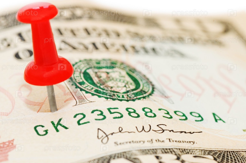 Красная канцелярская кнопка, воткнутая в американскую банкноту