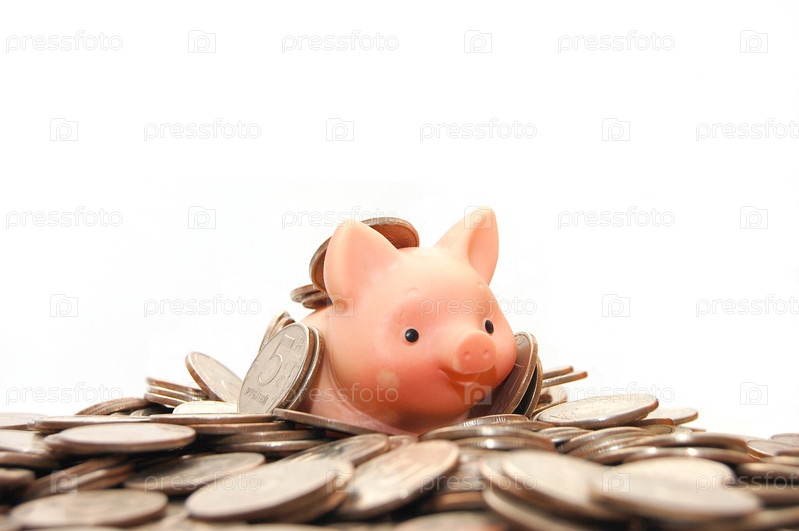 Маленькая розовая хрюшка в окружении пятирублевых монет