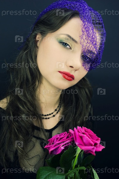 Портрет женщины в завесе с букетом роз