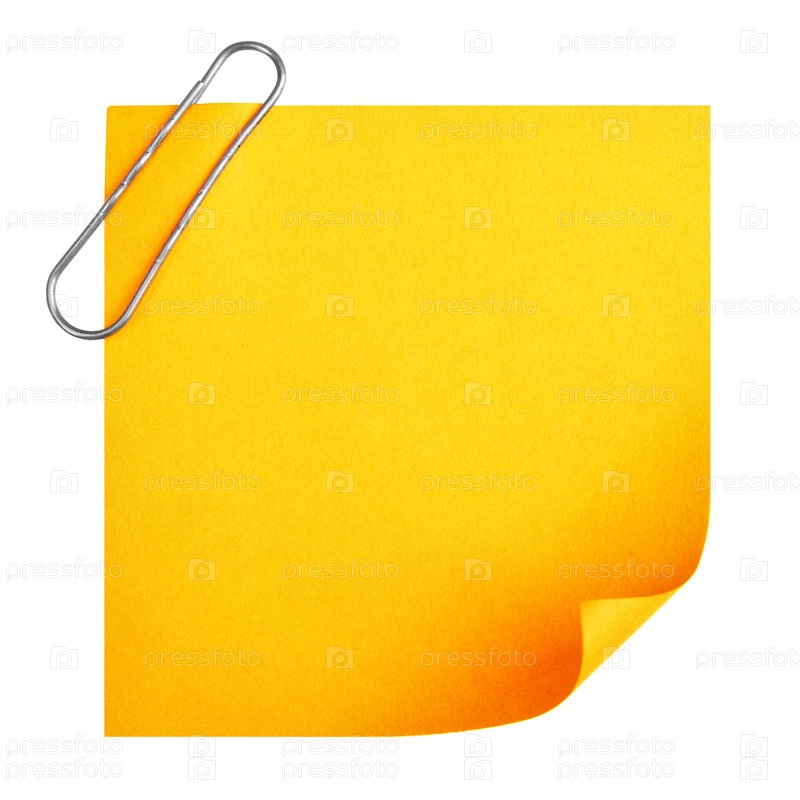Желтый стикер со скрепкой на белом фоне