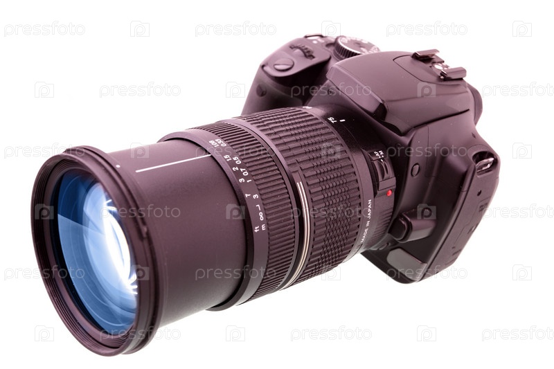 Профессиональная фотокамера на белом фоне