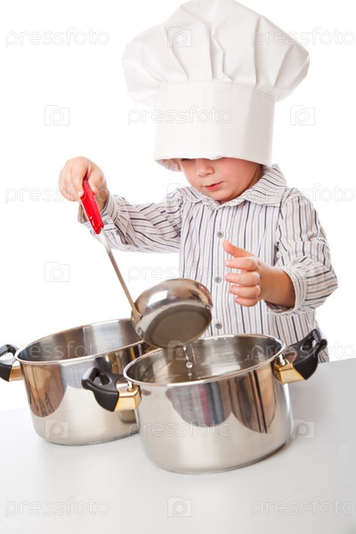 Мальчик изображает повара. Изолирован на белом фоне