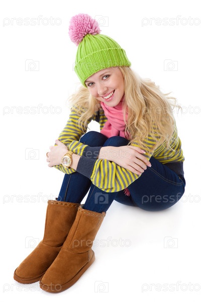 Красивая улыбающаяся девушка в вязаной шапке. Изолирована на белом фоне