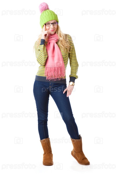 Красивая улыбающаяся девушка в вязаной шапке. Изолирована на белом фоне