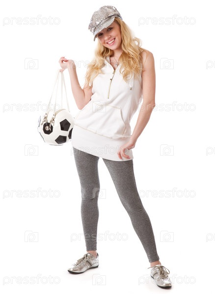 Улыбающаяся девушка с сумочкой в виде футбольного мяча, изолирована на белом фоне